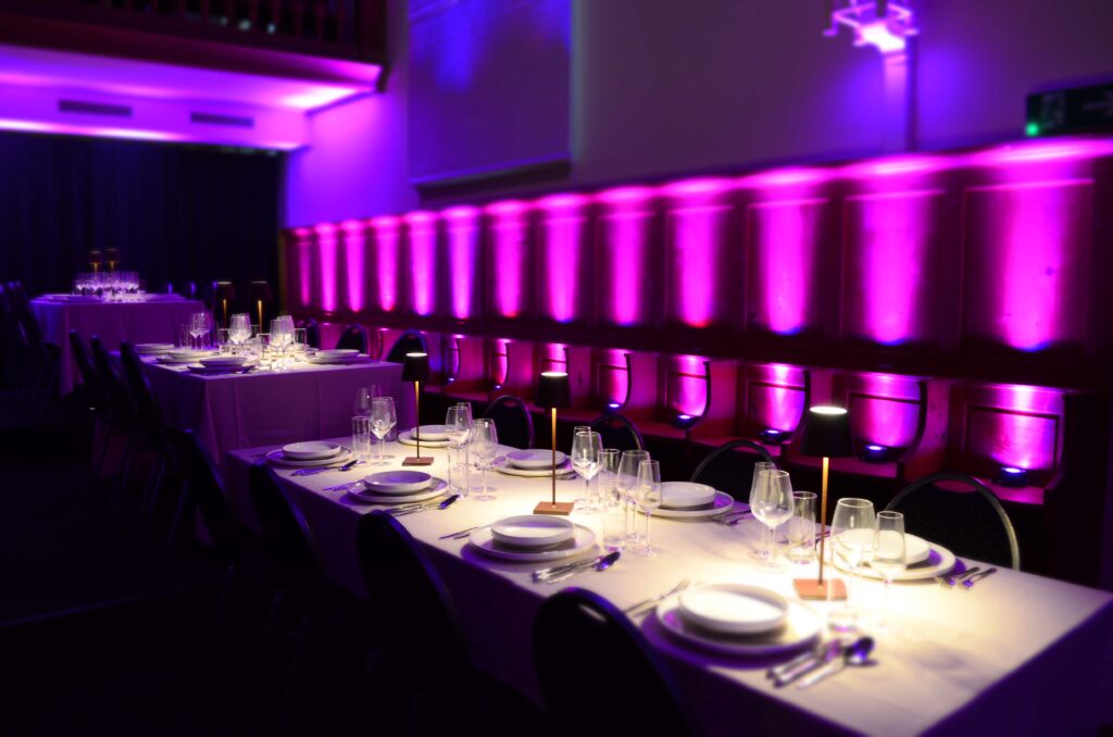 Für stilvolle Galadinner oder Hochzeiten mit Essen bieten wir die Konsumationsbestuhlung mit Stühlen und Tischen bis zu 100 Personen sitzend an. Der Raum 2 bietet Platz für weitere 50 Personen.